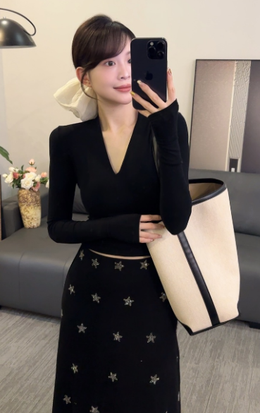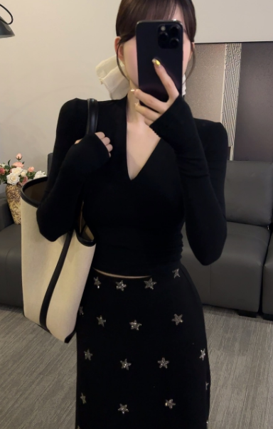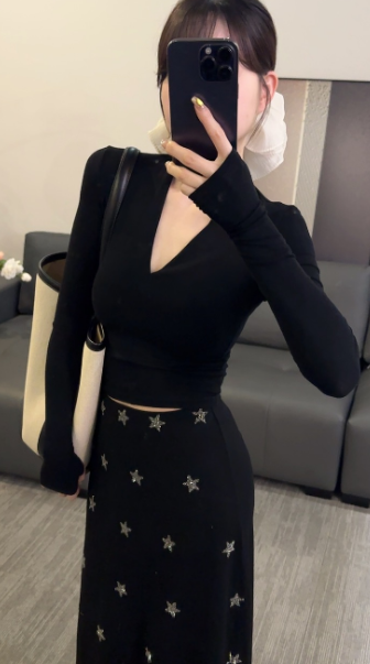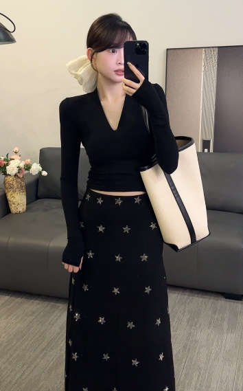 【os&oneshow】fashion two piece set – black v neck rhinestone top with casual maxi skirt【OS&oneshow】Fashion Two-Piece Set – Black V-Neck Rhinestone Top with Casual Maxi Skirt 032