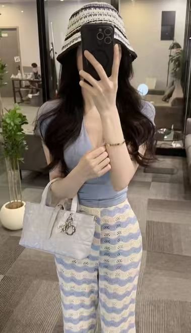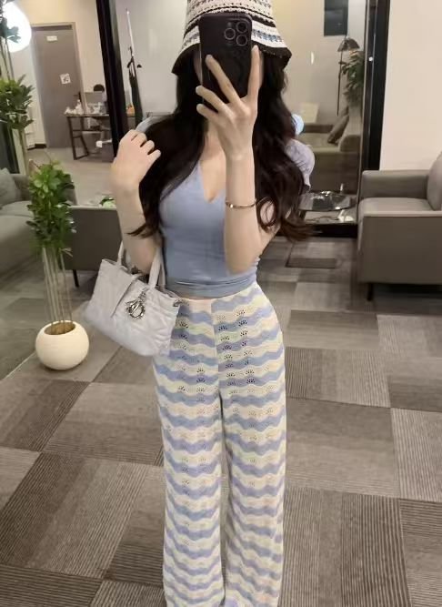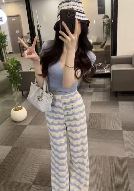 【OS&oneshow】Summer Blue and White Stripe Two-Piece Set – Top with Straight Wide-Leg Pants 018
