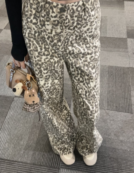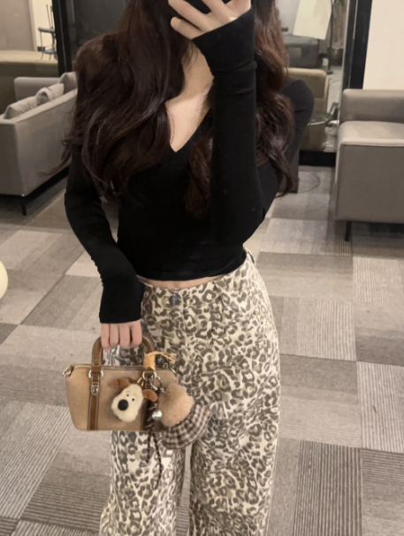 【OS&oneshow 】2025 Early Autumn Two-Piece Set – Black T-Shirt with High-Waist Straight Pants and Leopard Wide-Leg Trousers 031